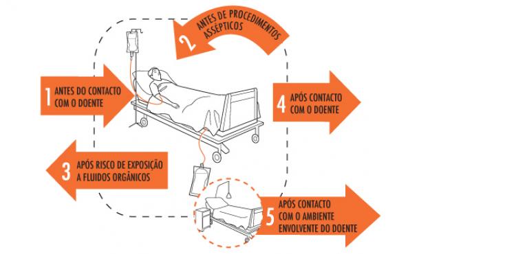 A OMS propôs um modelo a que chamou os "cinco momentos" que mais não são do que cinco tipos de oportunidades que os profissionais têm para higienização das mãos.Assim, quando devem os profissionais de saúde higienizar as mãos?